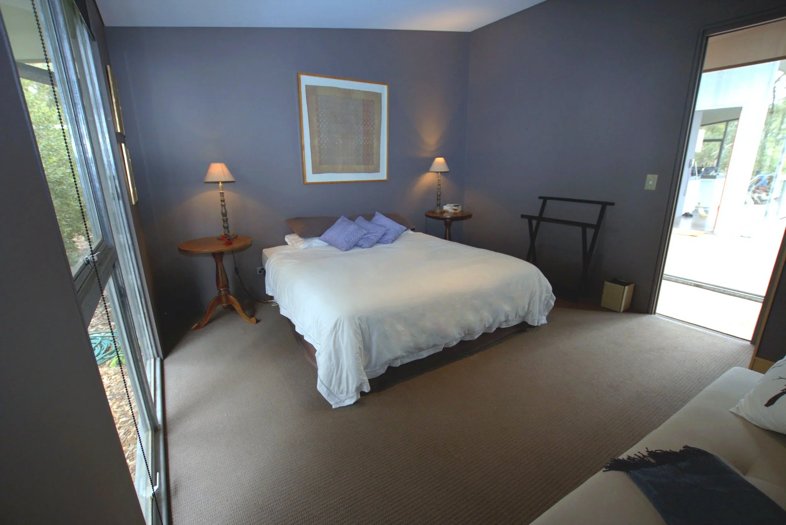 The βmaster bedroomβ with a king bed and walk in robe. The Valley King presents sweeping, uninterupted views across the Wollondilly Valley, bushland and lawns. It shares a large separate bathroom with double showers and vanity with the Bush King.