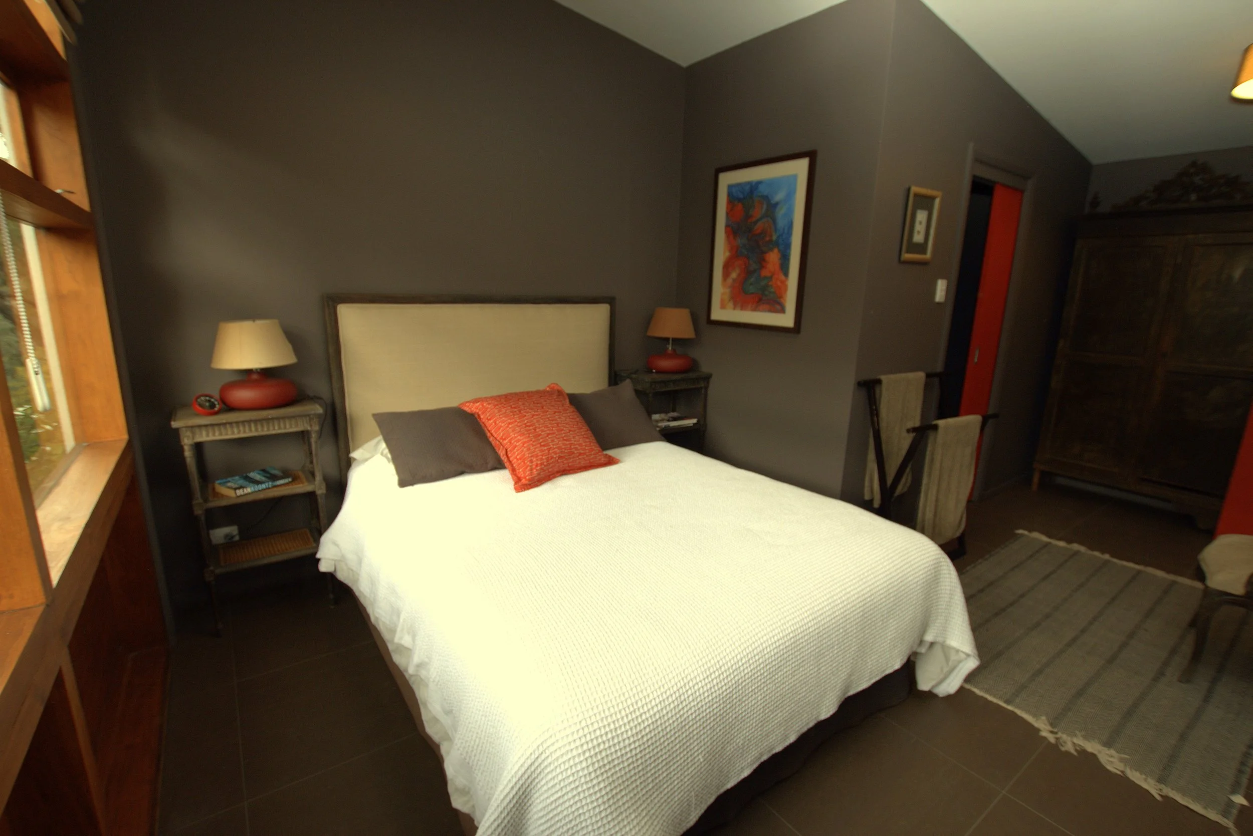 The Bush King has a king bed with beautiful bush views through floor to ceiling windows. It shares a large separate bathroom with double showers and vanity with the Valley King. The Bush King is the perfect room for children or friends that would like to be under the same roof as the Valley King guests. Plenty of room to put a cot you bring from home.